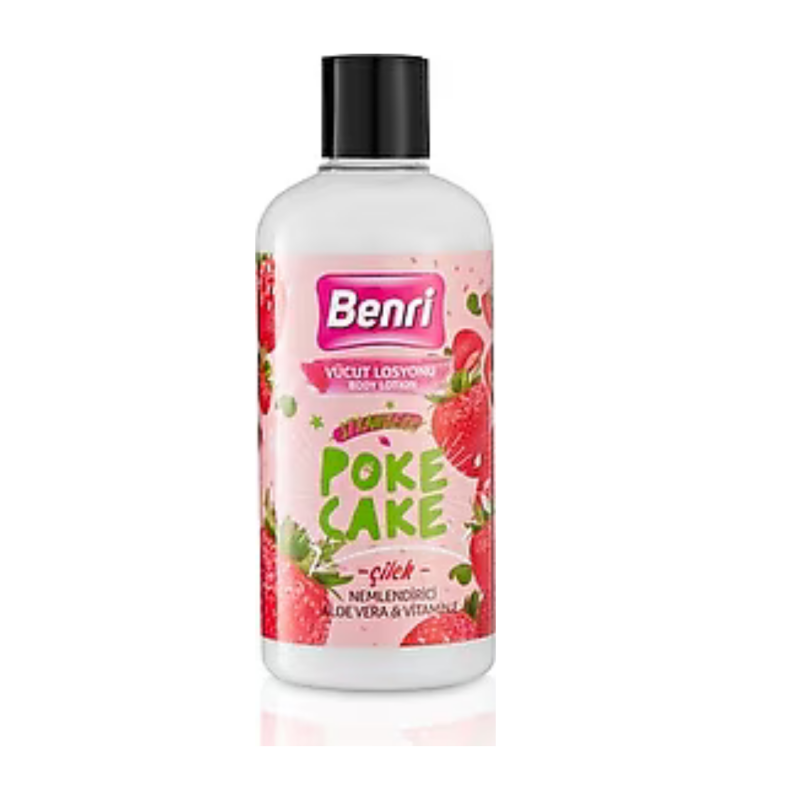 The Benri Poke Cake Body Lotion with strawberry scent is a fun, fruity treat for your skin. Enriched with Aloe Vera and Vitamin E, it provides long-lasting hydration and care while leaving your skin with a delicious strawberry cake fragrance.