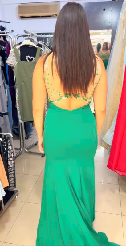 • Jersey evening dress has beaded bodice and beaded straps, cut out back, Chiffon Fly Away skirt, and Zipper Back Closure